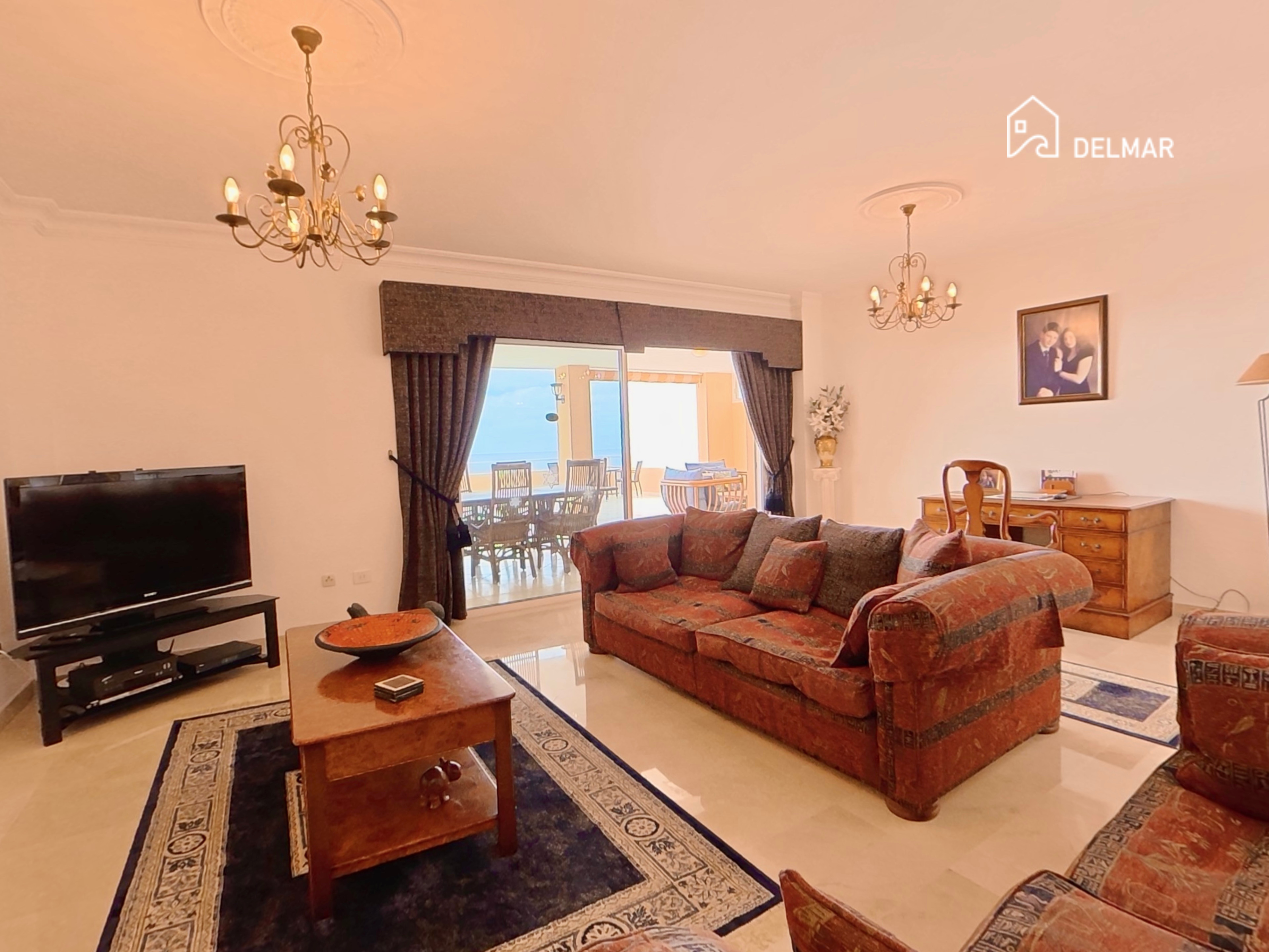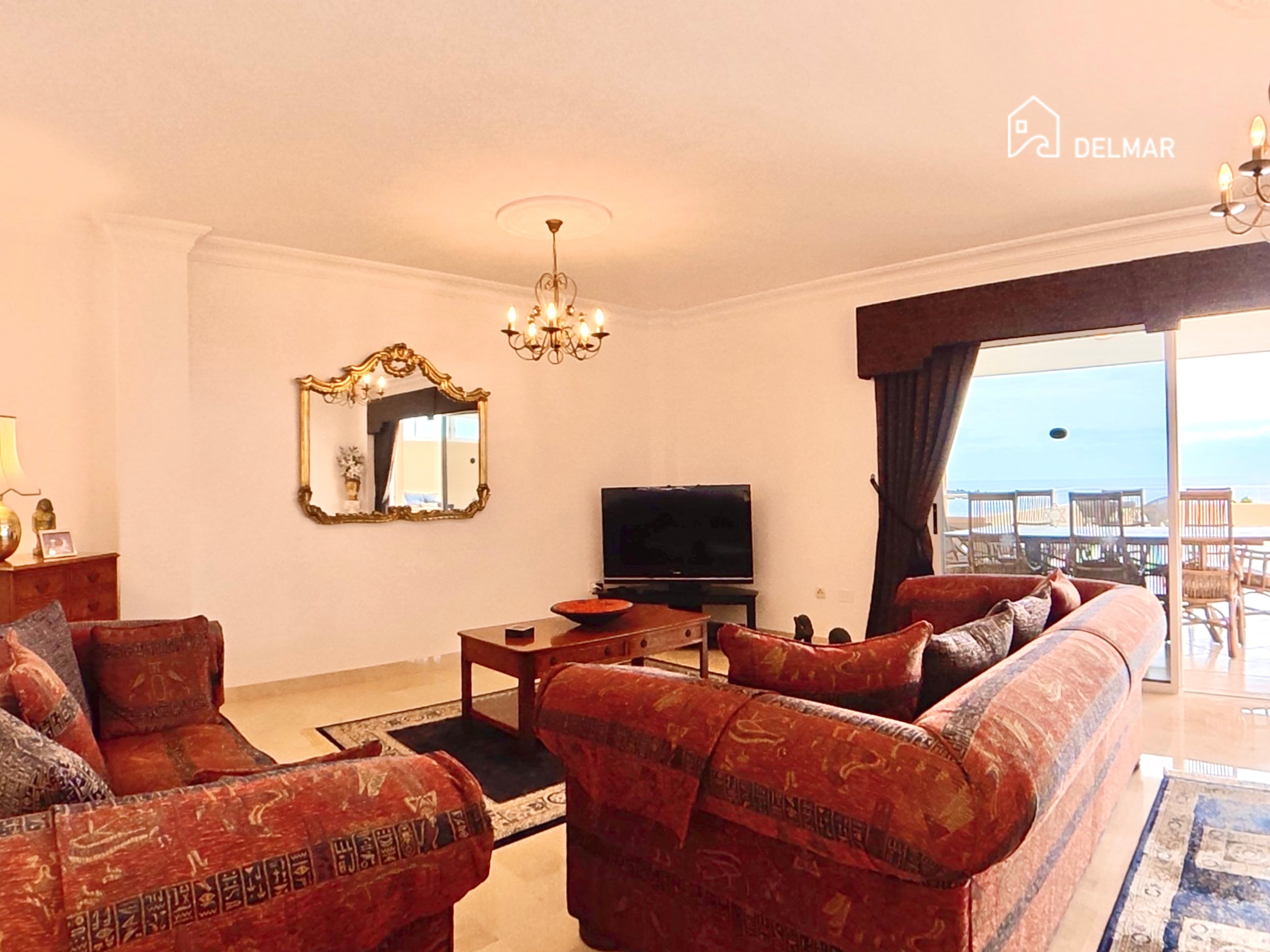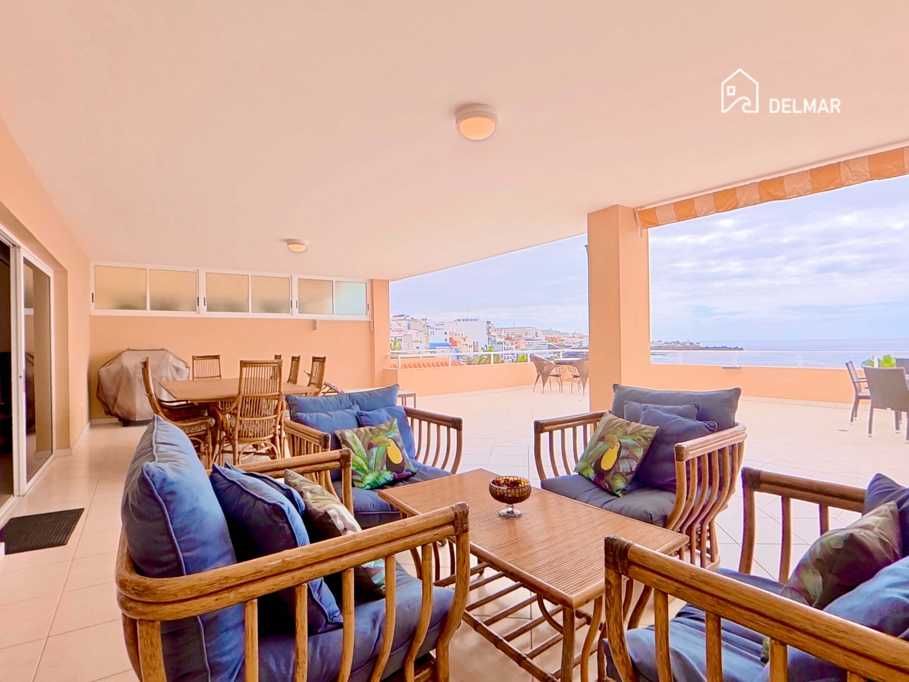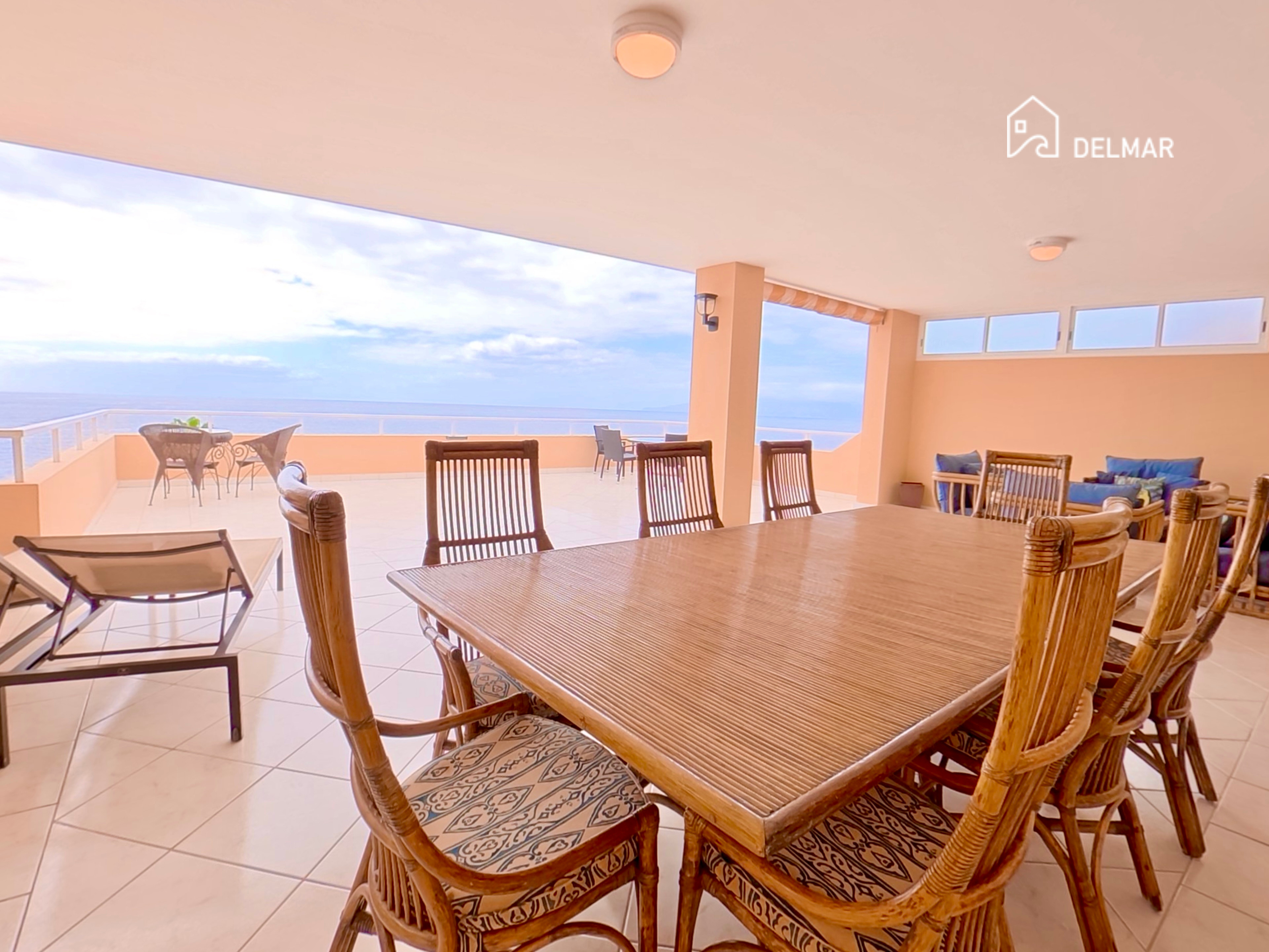 Die Wohnung empfängt Sie mit einem hellen und luftigen Wohnbereich, der durch hohe Decken und elegante cremefarbene Marmorböden unterstrichen wird, die ein Gefühl von Großzügigkeit und Eleganz vermitteln. Große Türen führen direkt auf die außergewöhnlich große private Terrasse (77 m²) und schaffen eine wunderbare Verbindung zwischen Innen- und Außenbereich. Diese beeindruckende Terrasse bietet viel Platz zum Sonnenbaden, Essen im Freien oder Entspannen, während Sie den schönen offenen Meerblick und das ganzjährig angenehme Klima Teneriffas genießen.