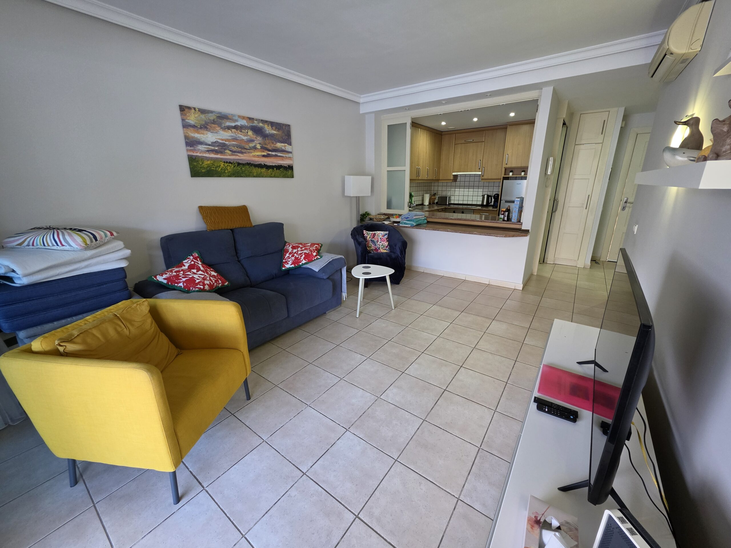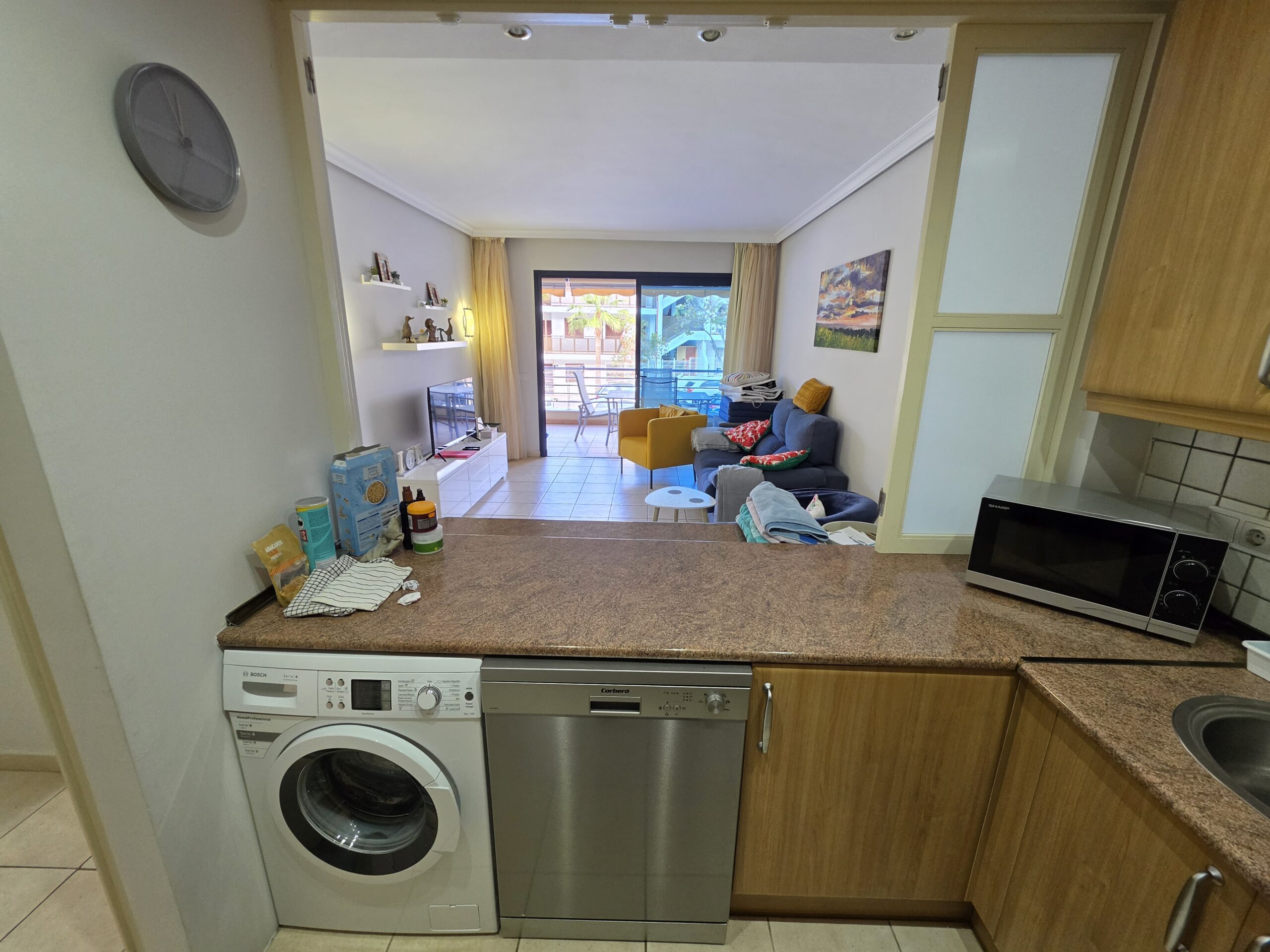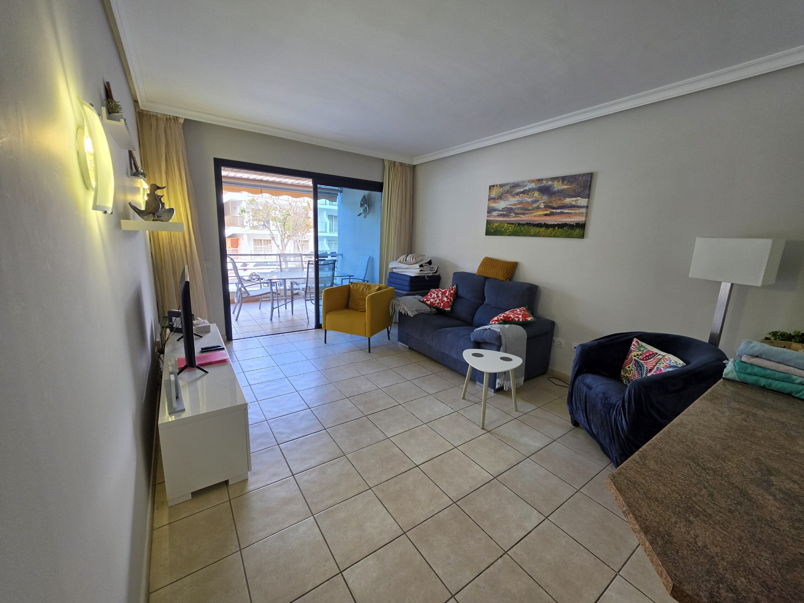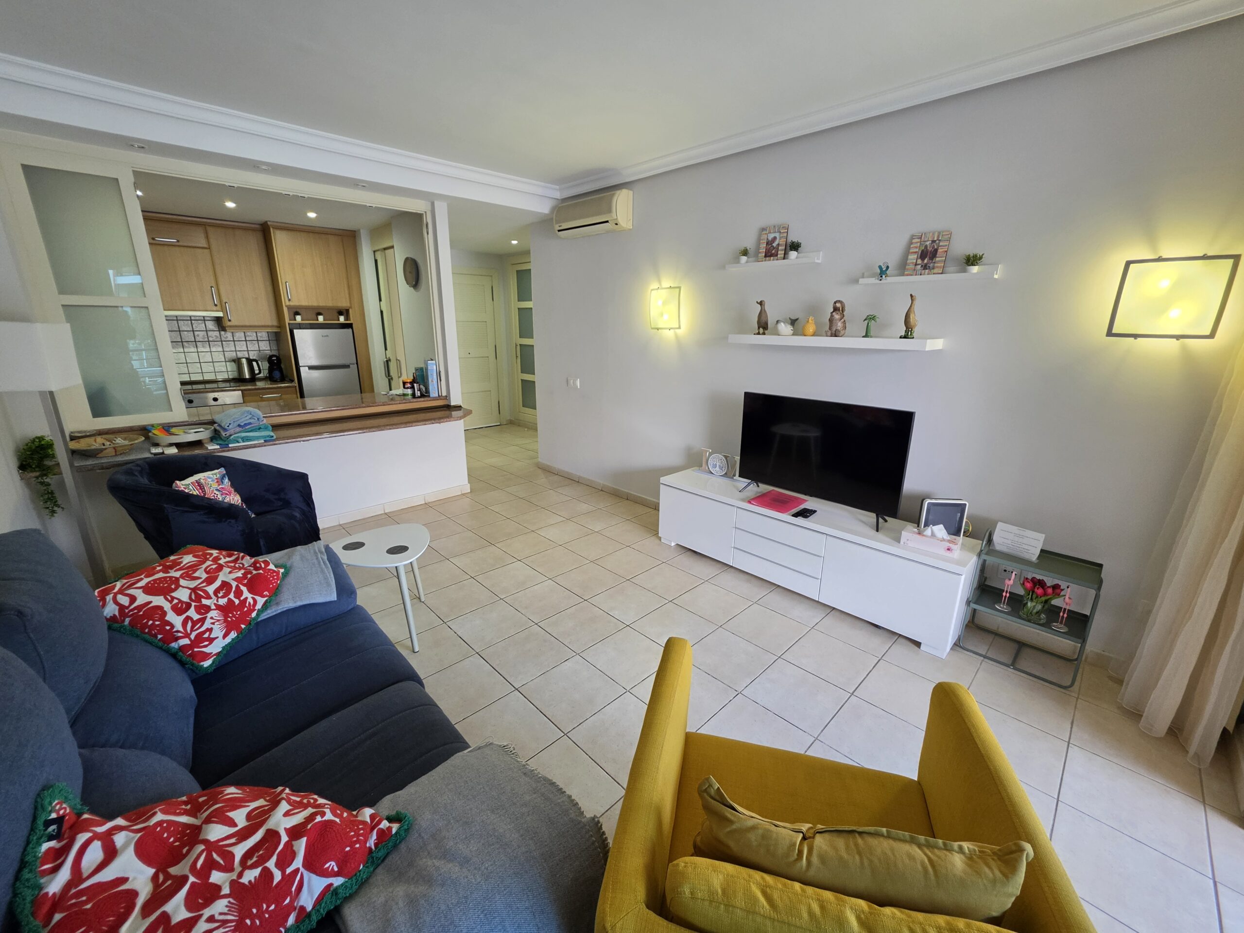 The apartment features a bright and welcoming lounge and dining area with built-in air conditioning, comfortably furnished and designed for both everyday living and holiday use. From here, there is direct access to the spacious terrace, creating a pleasant indoor–outdoor flow and providing the perfect space to relax, dine al fresco or enjoy Tenerife’s mild climate throughout the year. The fitted kitchen is practical and well integrated, offering ample storage and workspace, and is equipped with appliances including a dishwasher and washing machine for added convenience.