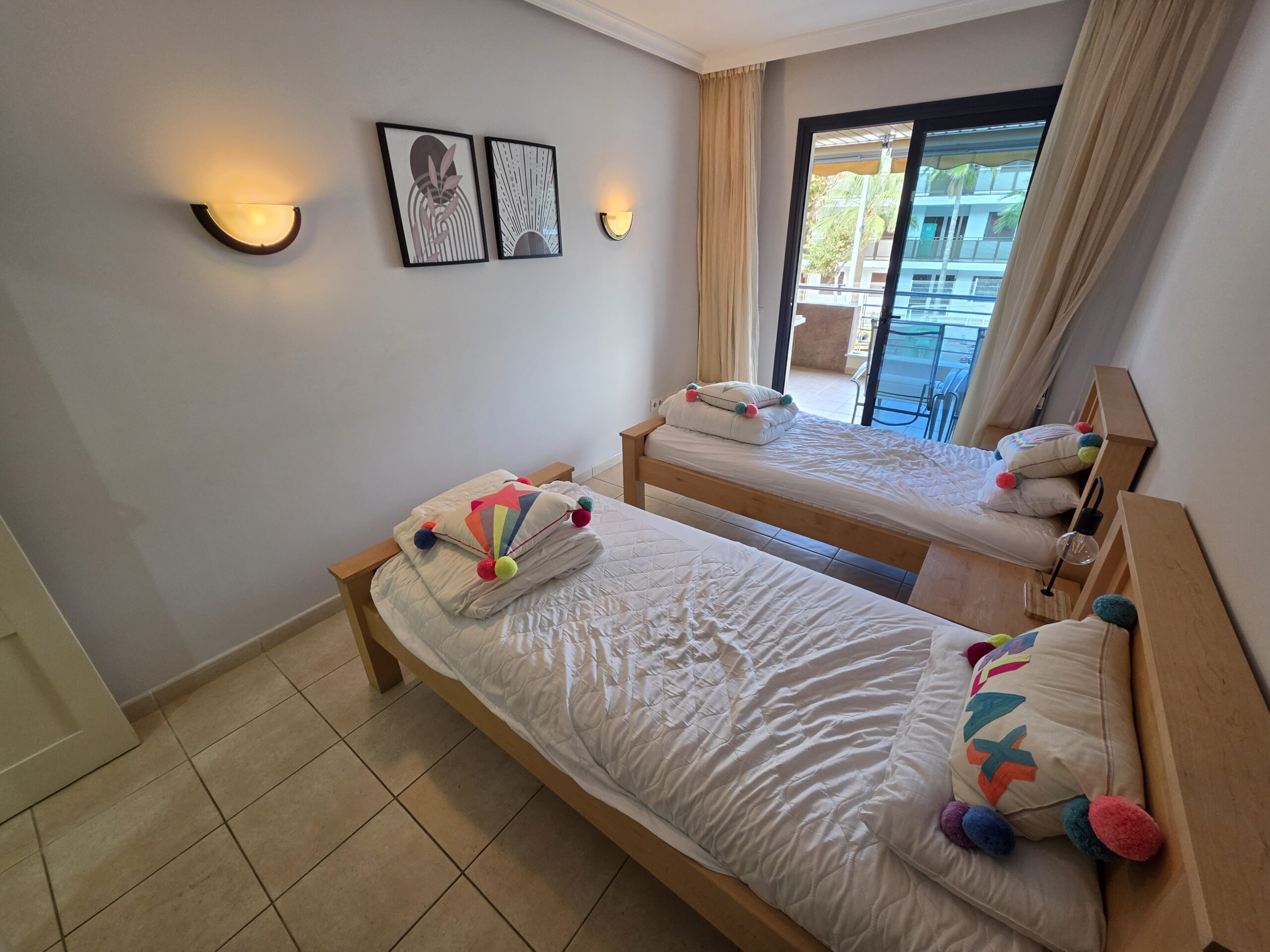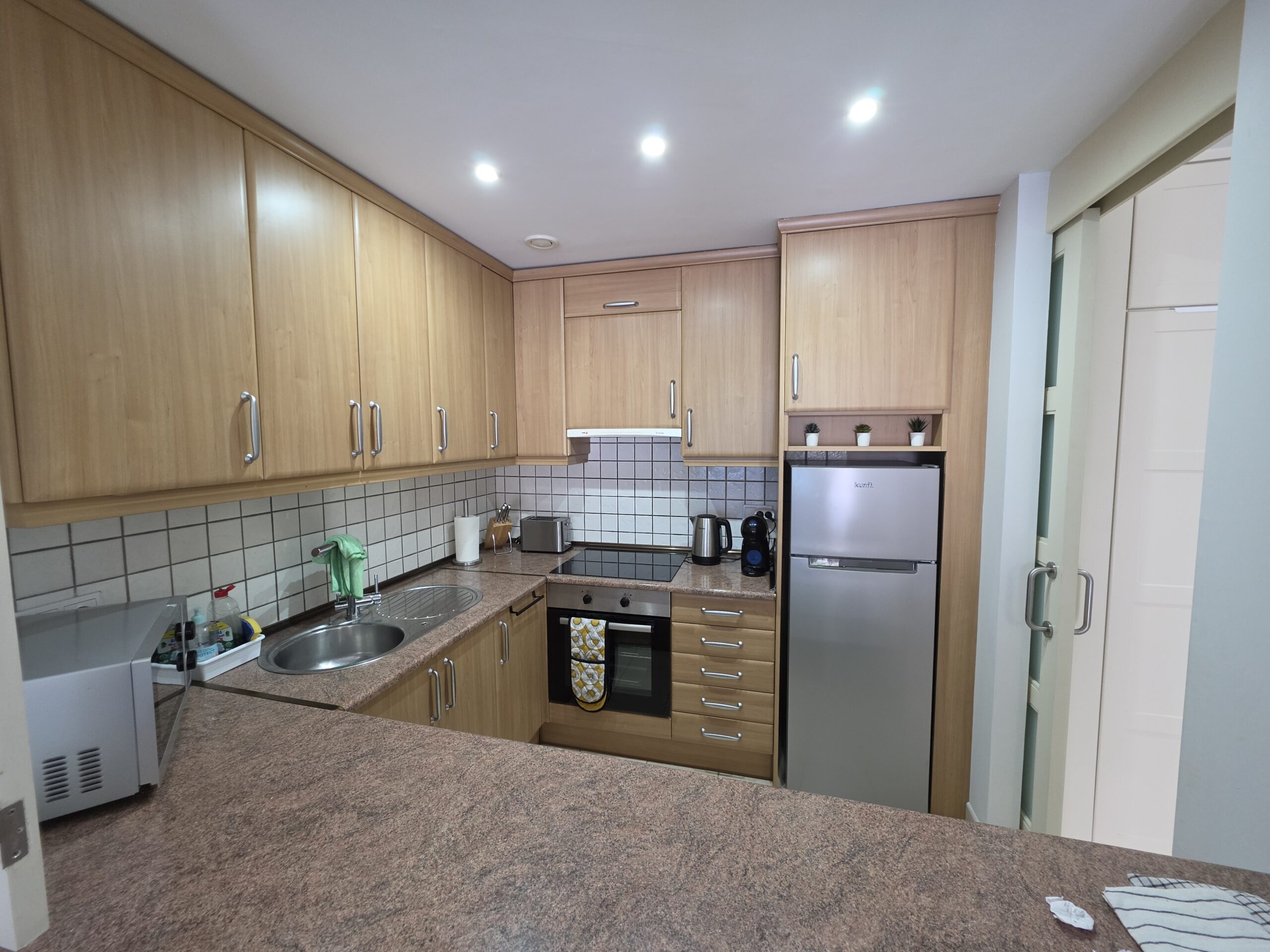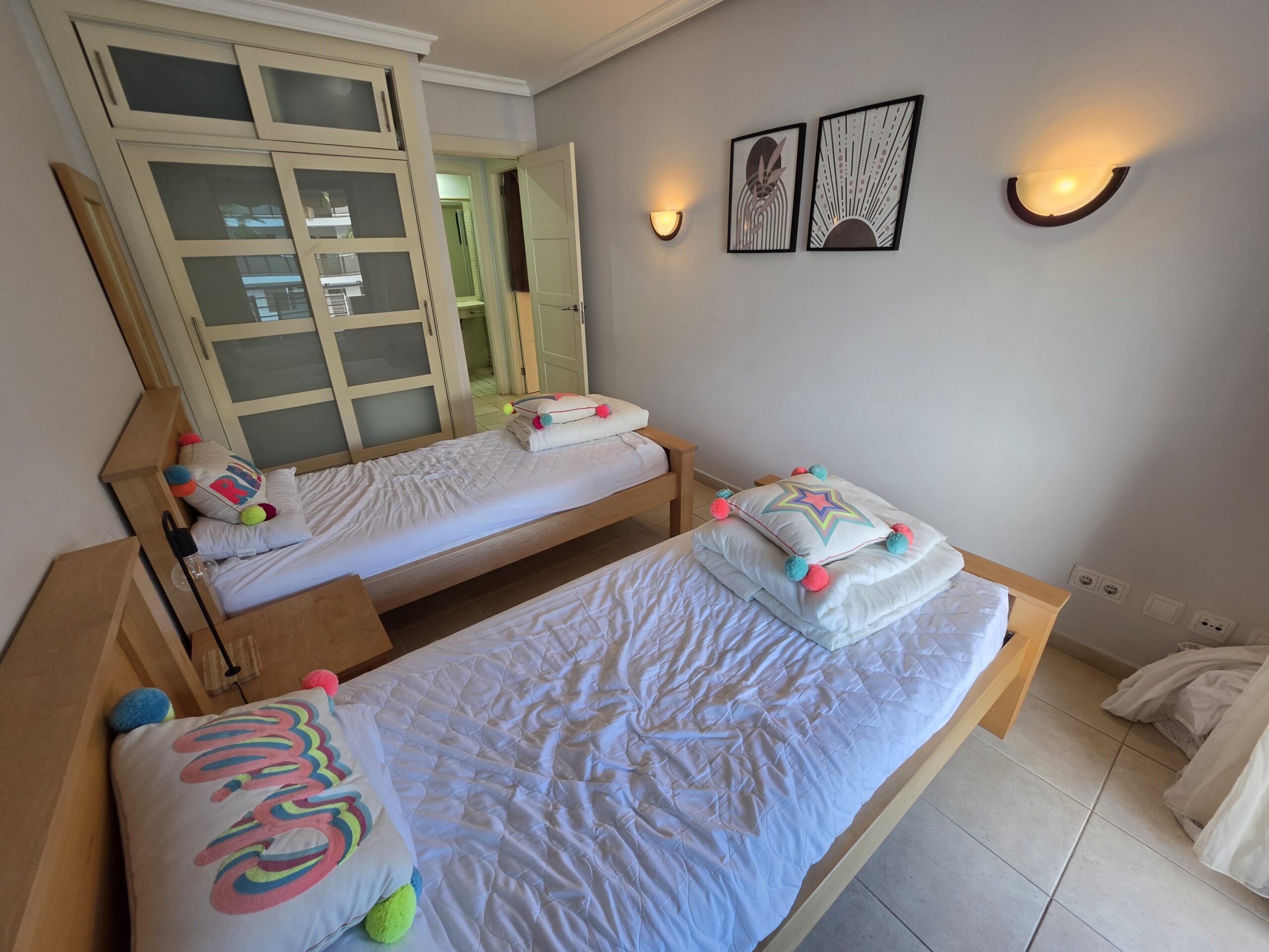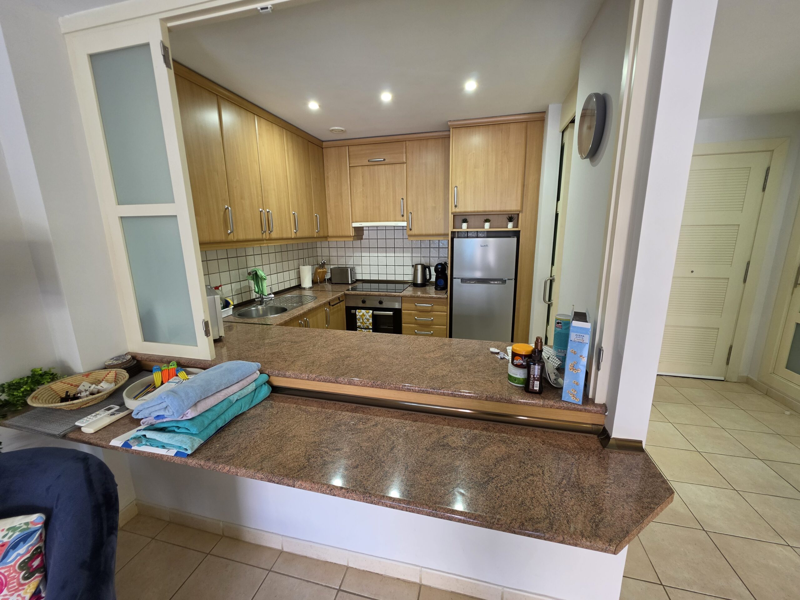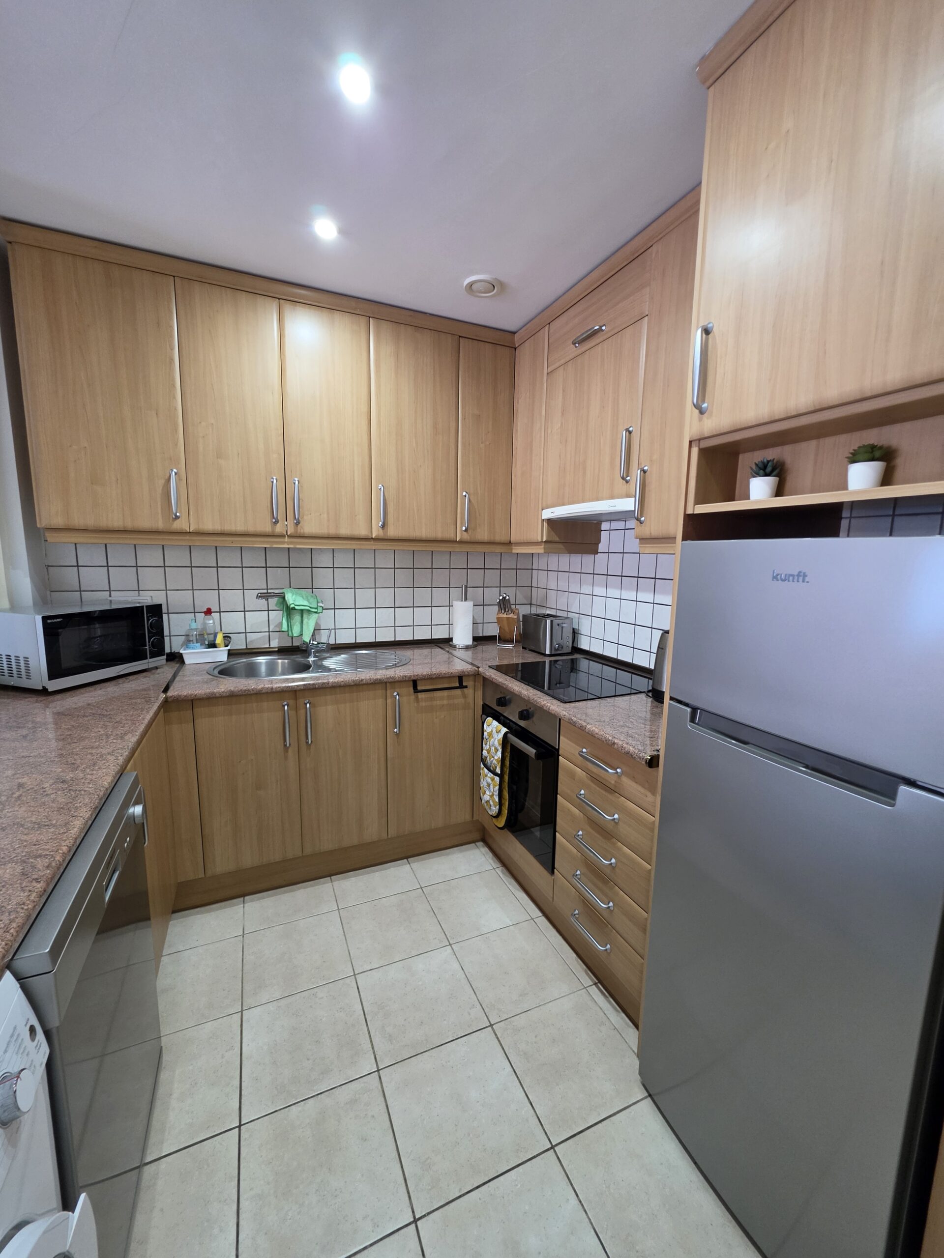 The apartment features a bright and welcoming lounge and dining area with built-in air conditioning, comfortably furnished and designed for both everyday living and holiday use. From here, there is direct access to the spacious terrace, creating a pleasant indoor–outdoor flow and providing the perfect space to relax, dine al fresco or enjoy Tenerife’s mild climate throughout the year. The fitted kitchen is practical and well integrated, offering ample storage and workspace, and is equipped with appliances including a dishwasher and washing machine for added convenience.