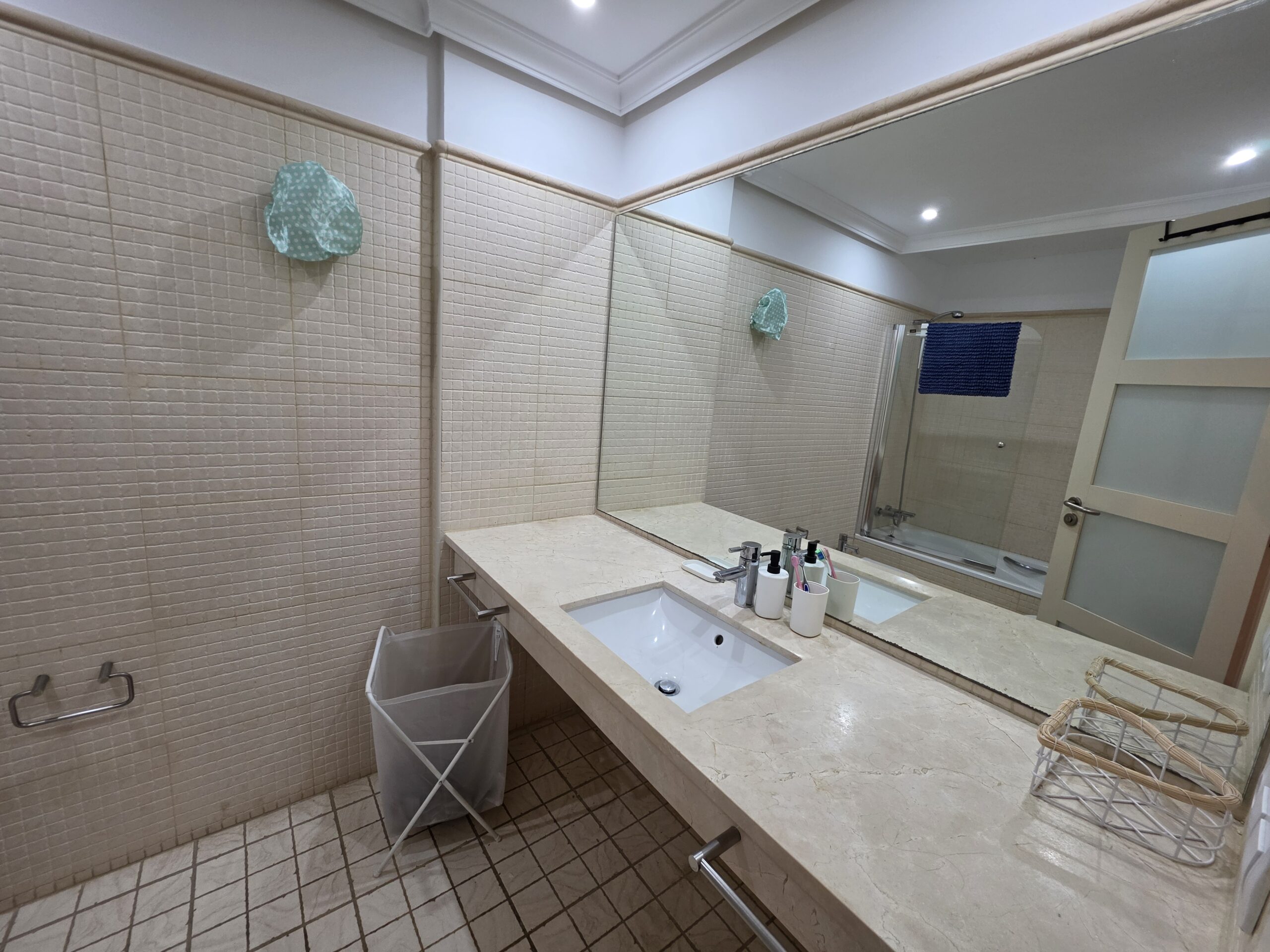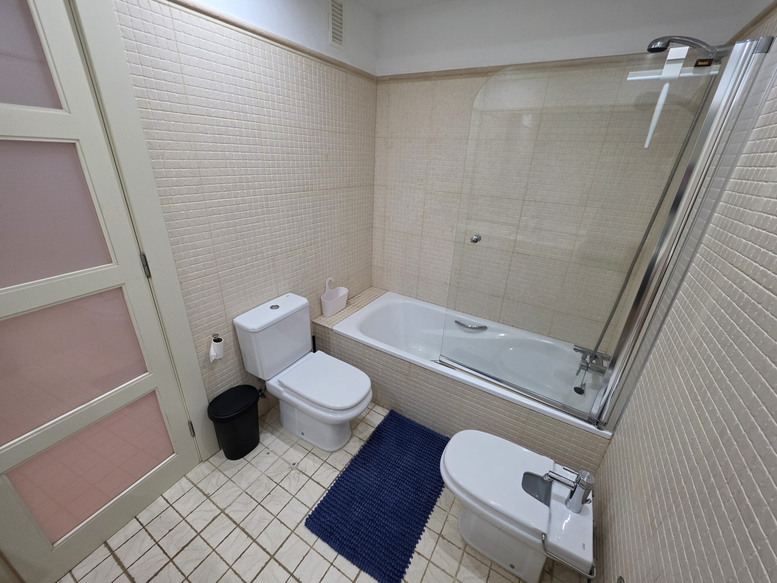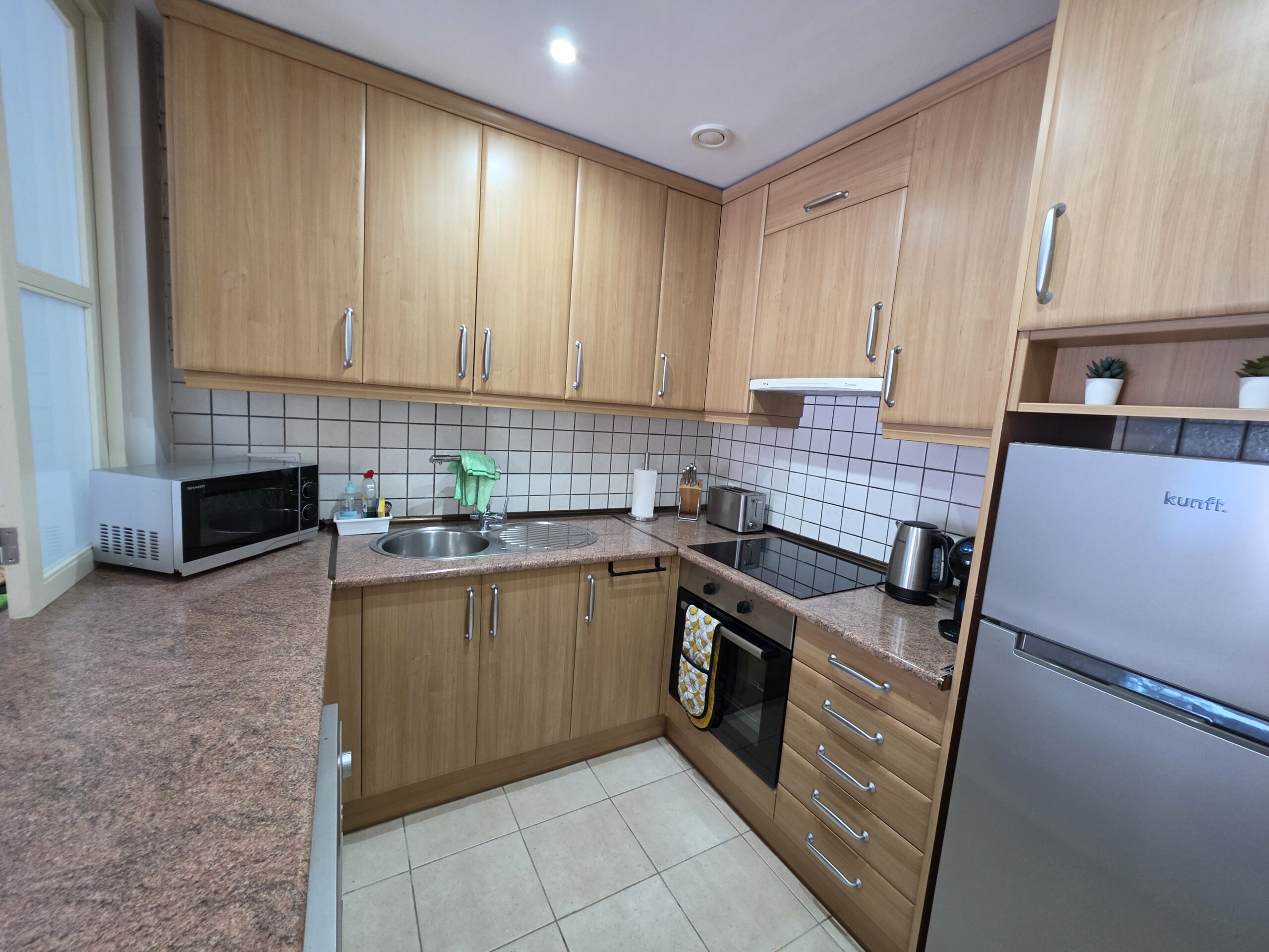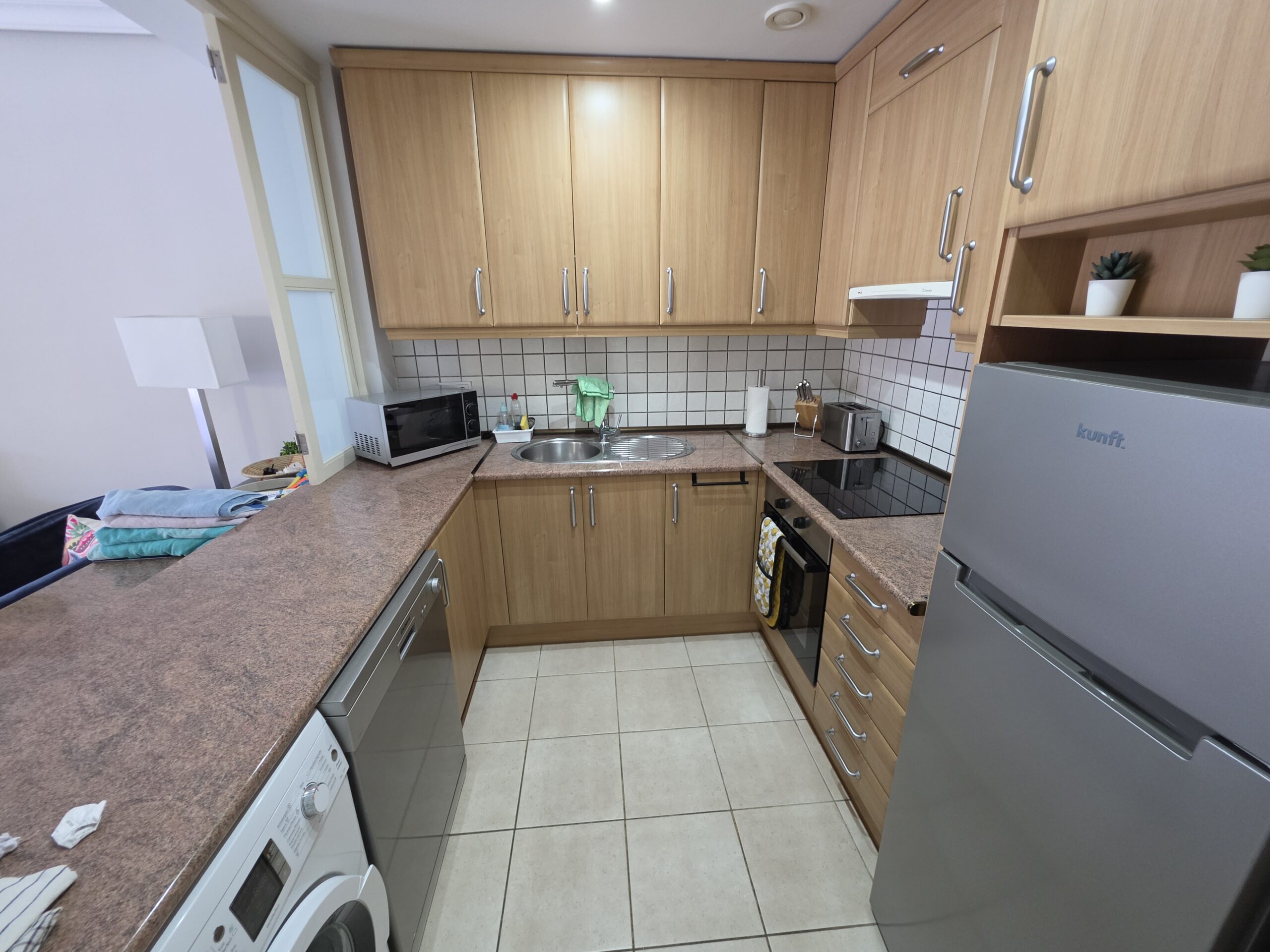 The apartment features a bright and welcoming lounge and dining area with built-in air conditioning, comfortably furnished and designed for both everyday living and holiday use. From here, there is direct access to the spacious terrace, creating a pleasant indoor–outdoor flow and providing the perfect space to relax, dine al fresco or enjoy Tenerife’s mild climate throughout the year. The fitted kitchen is practical and well integrated, offering ample storage and workspace, and is equipped with appliances including a dishwasher and washing machine for added convenience.