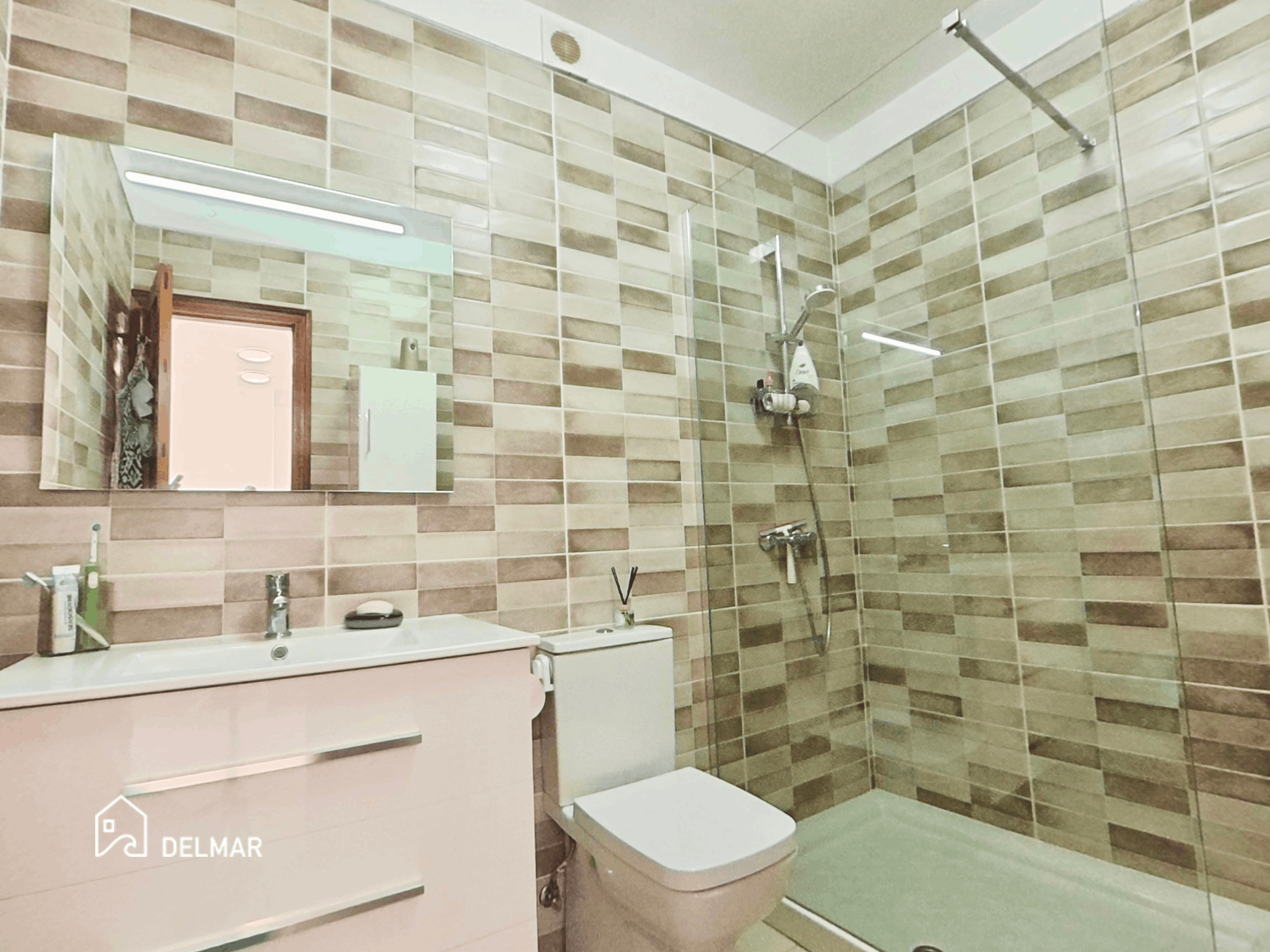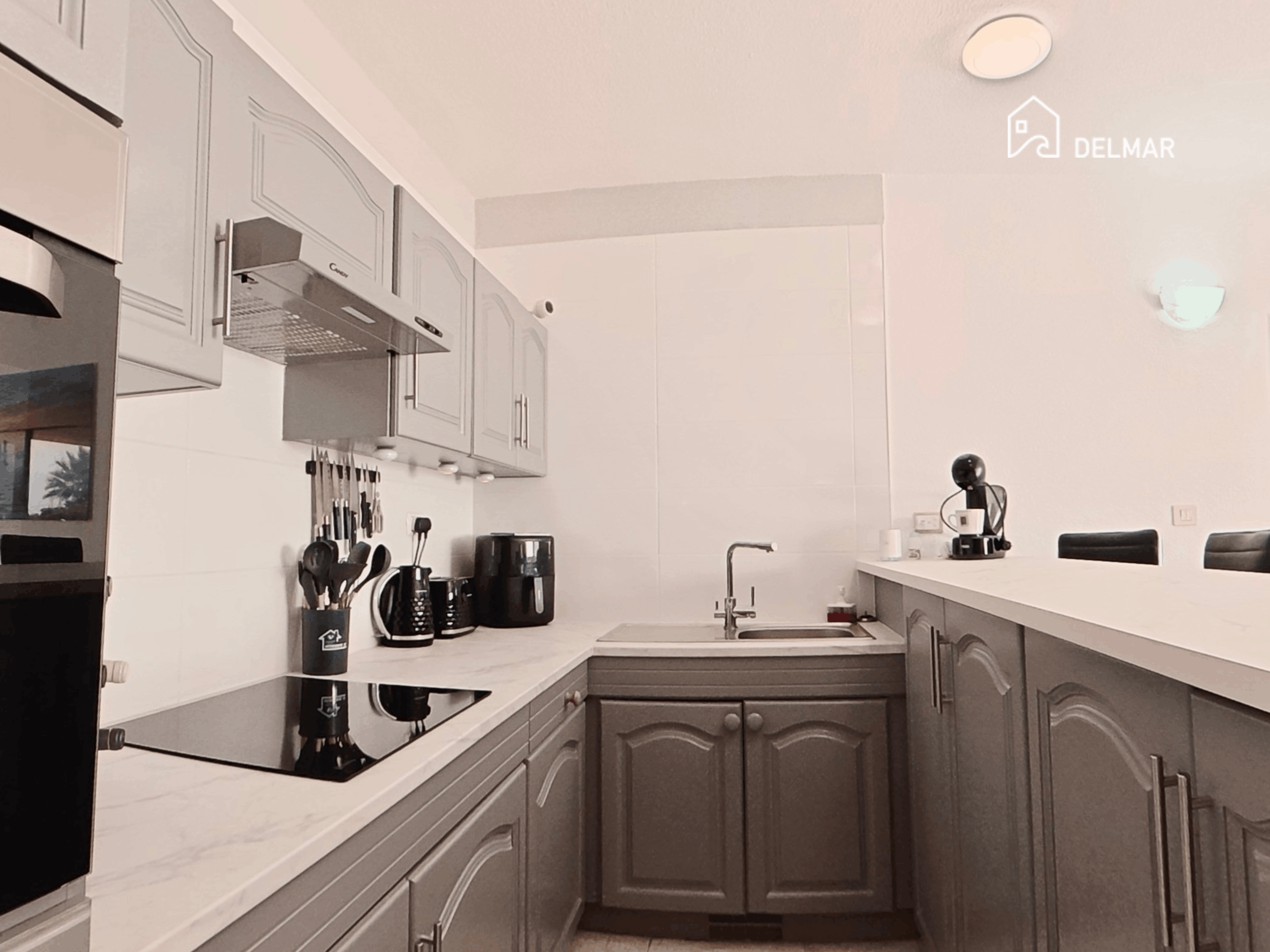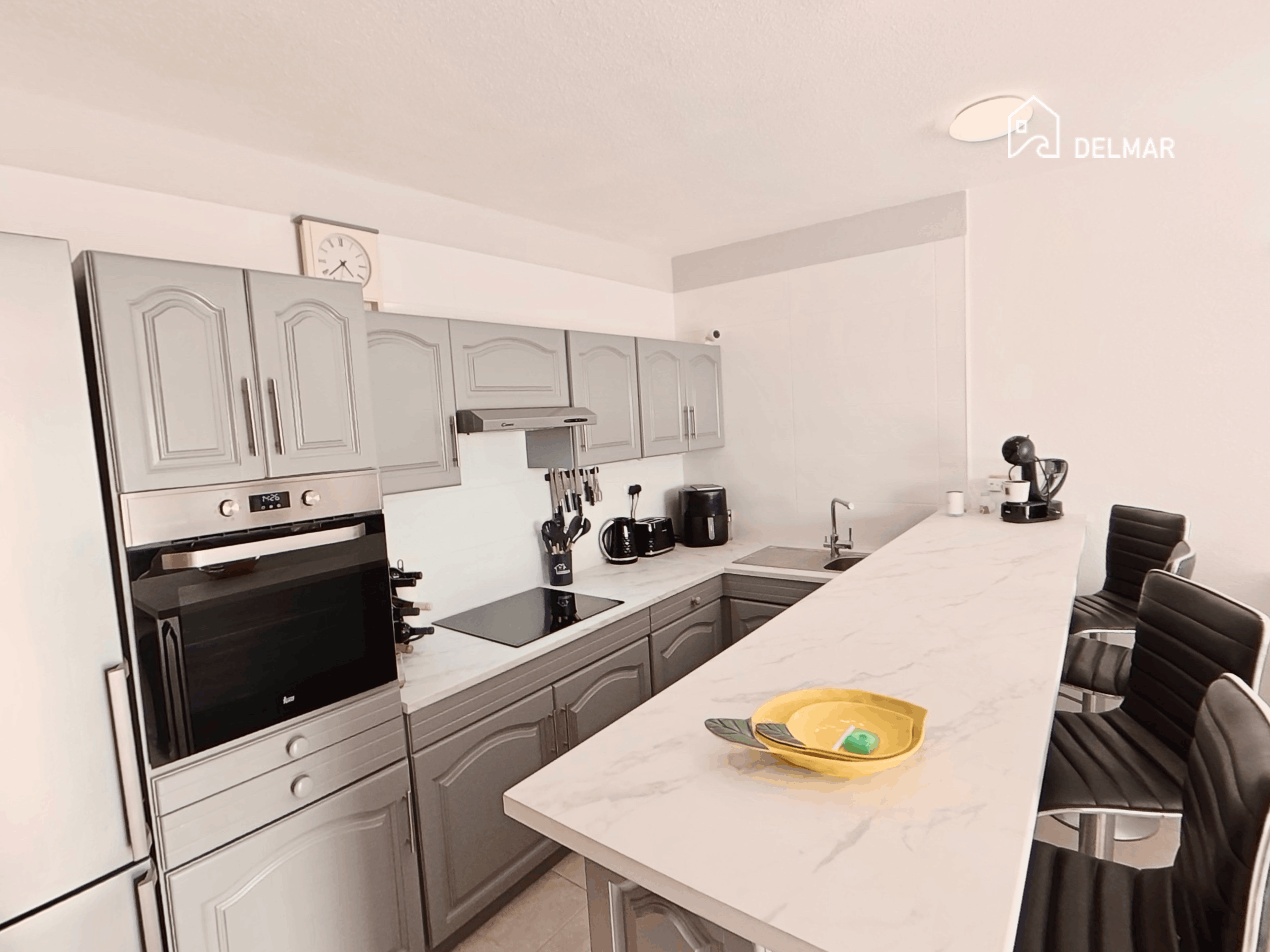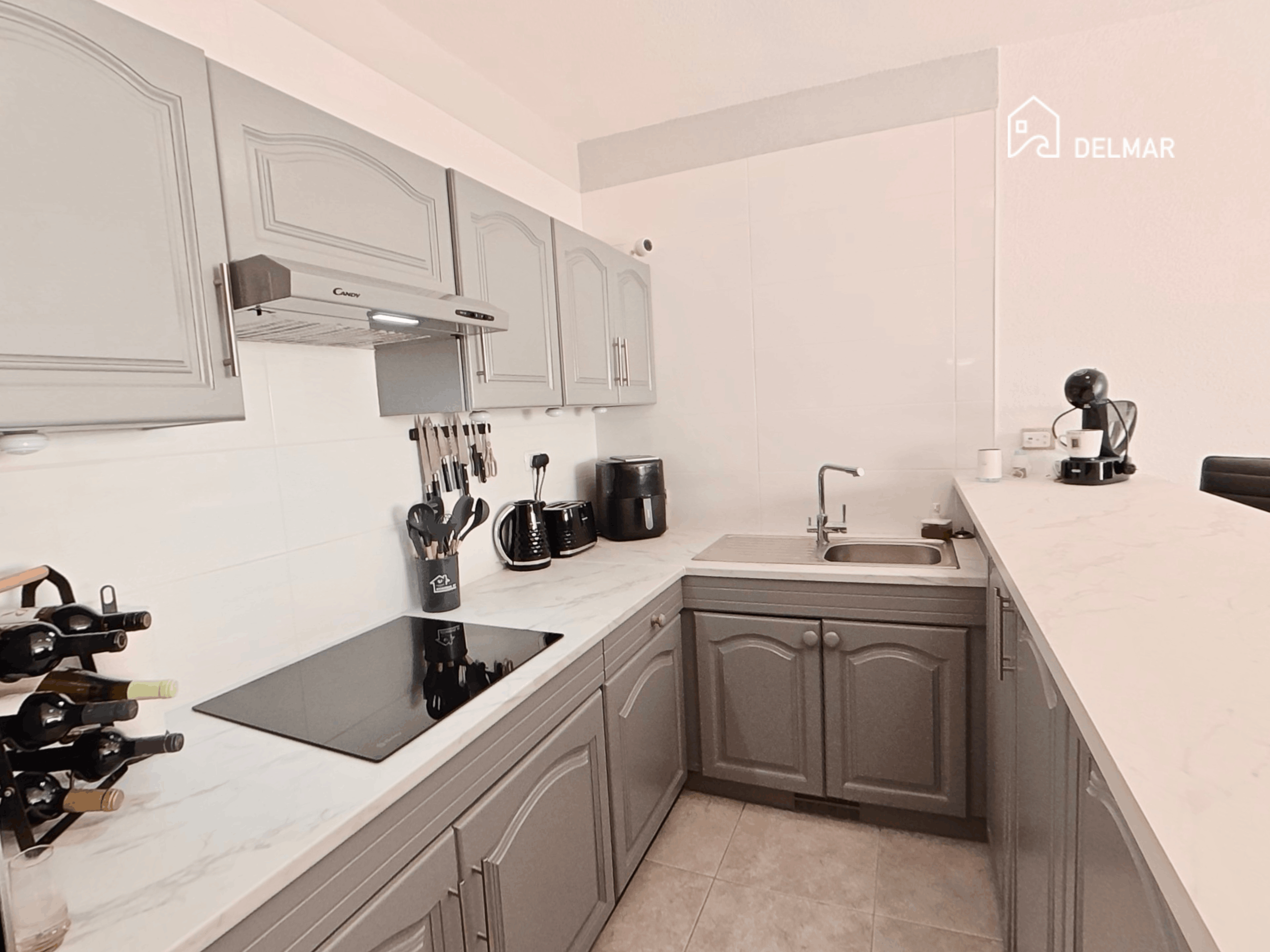 Inside, the home is bright and welcoming, with a well-proportioned lounge and dining area that connects naturally to the outdoor space. The fitted kitchen is practical and well equipped, while the recently refurbished bathroom is finished in a modern style, as seen in the clean lines and contemporary tiling.