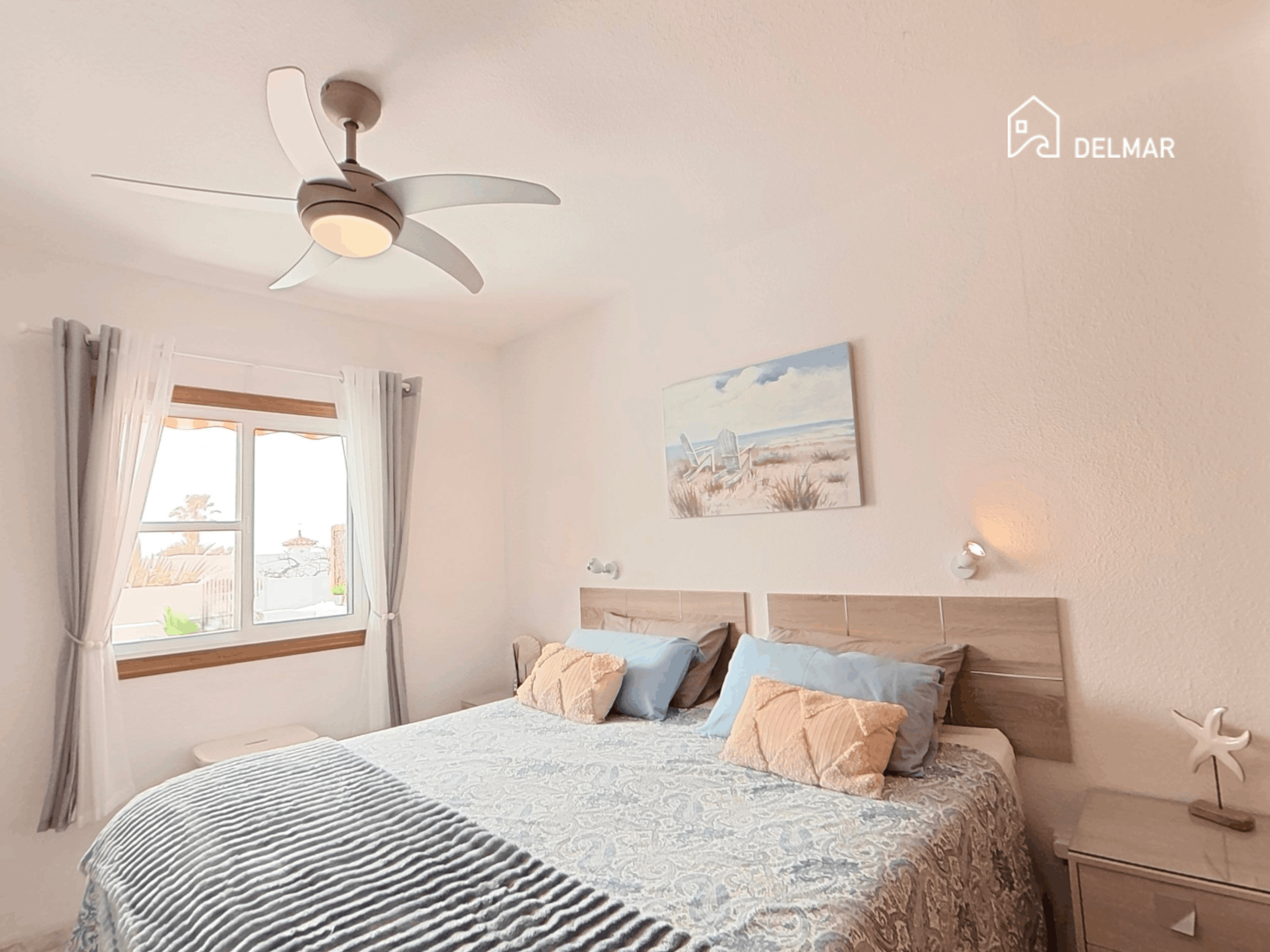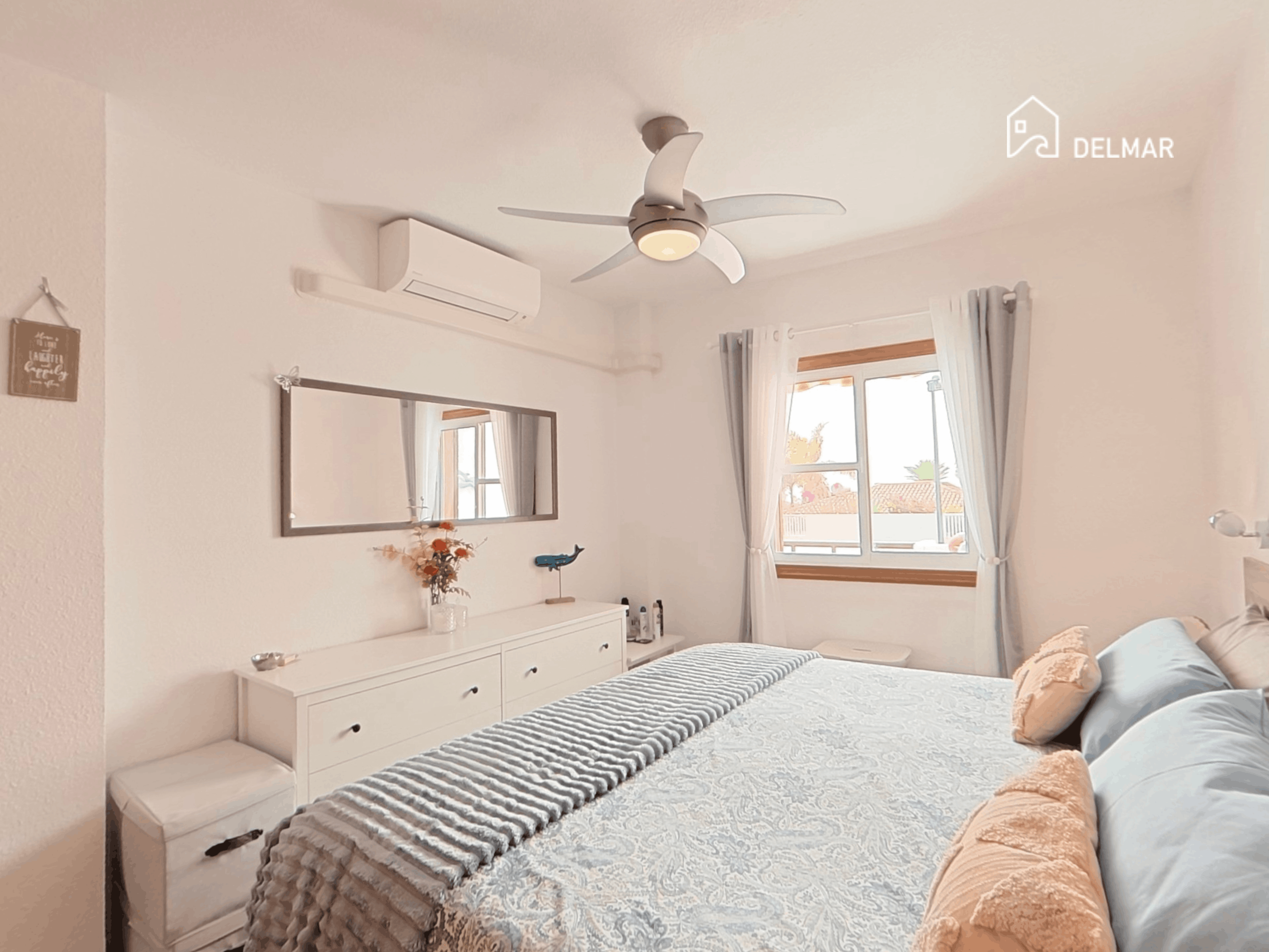 The bedroom is spacious and filled with natural light, offering a calm and comfortable retreat, complete with air conditioning for year-round comfort.