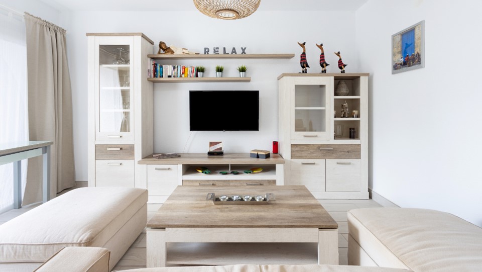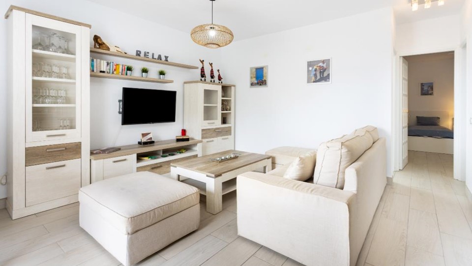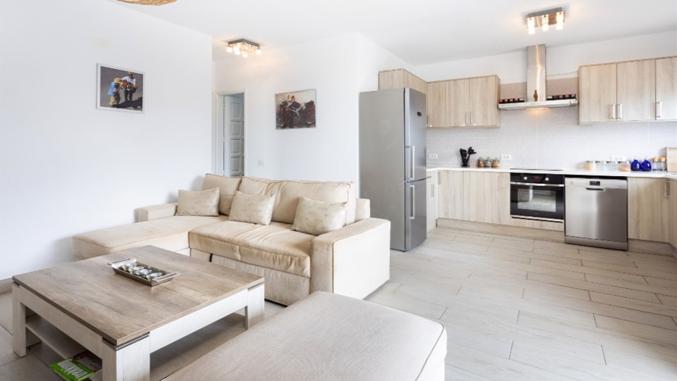 The apartment features a bright and comfortable lounge and dining area that opens directly onto the main terrace, allowing natural light to fill the interior while framing the beautiful sea views. Its south-facing orientation ensures excellent sunshine throughout the day, creating a warm and inviting living environment.